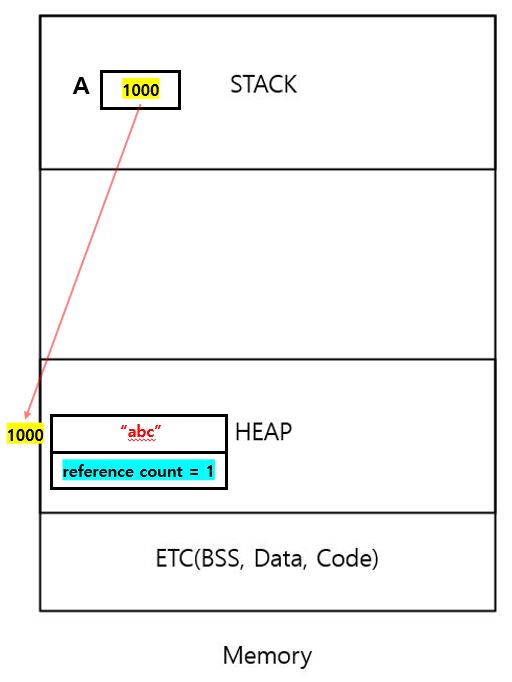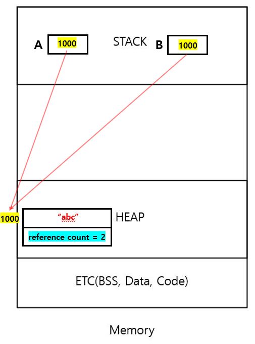 객체가 생성되면 해당 객체가 저장되어 있는 주소(Heap)에서 실제 value와 함께 reference count라는 변수가 1로 초기화된 상태로 저장된다.