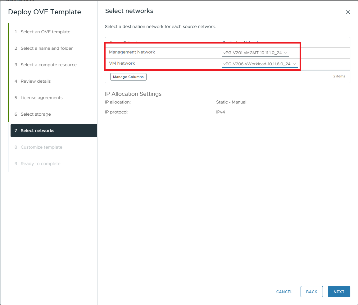 Select the port group for the Management Network to access HCIBench and the port group for the VM Network to deploy the test VMs, and then proceed with the deployment.
