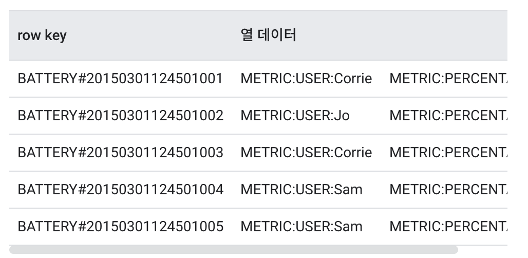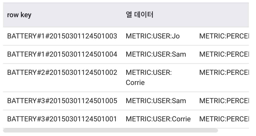 Column quantifiers are used like data. These design options are possible thanks to the scarcity of the Cloud Bigtable table and the ability to add new column qualifiers on the fly.
