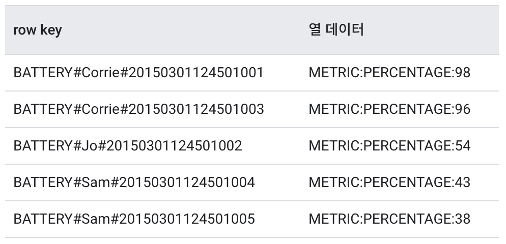 The user name is used as the row key. If the user name has an even alphabet, it is natural that data access is evenly achieved across the entire table. For more information on how Cloud Bigtable handles non-uniform loads, see Load balancing and Row key selection.