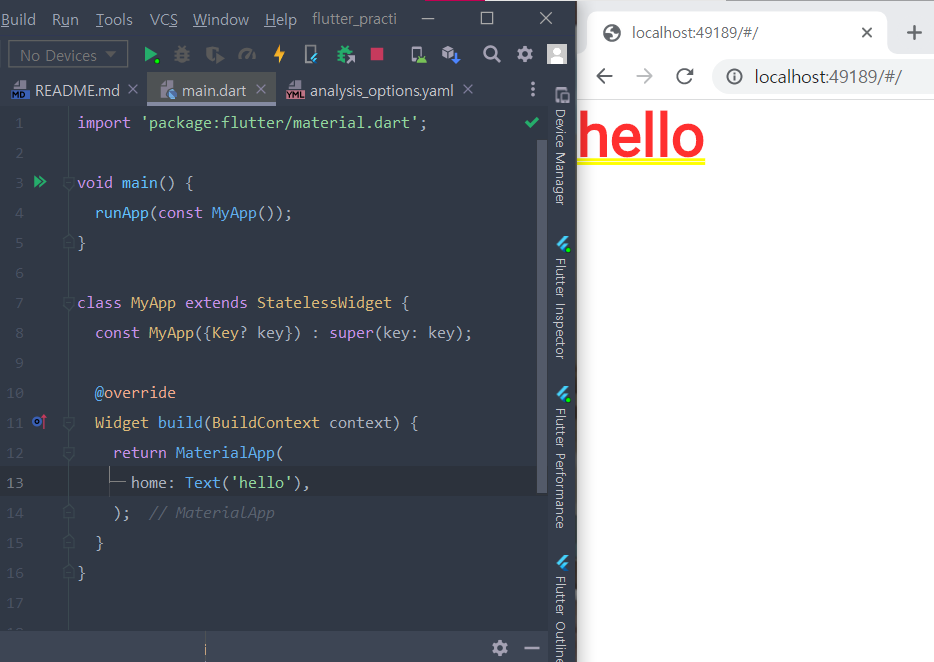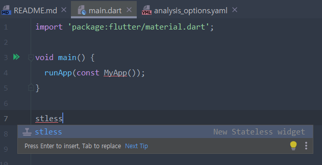 프로젝트 생성 후 lib에 있는 main.dart를 열어준다.