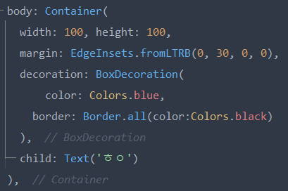 박스에 테두리를 넣을 땐 BoxDecoration에서 Border속성을 줘야한다.