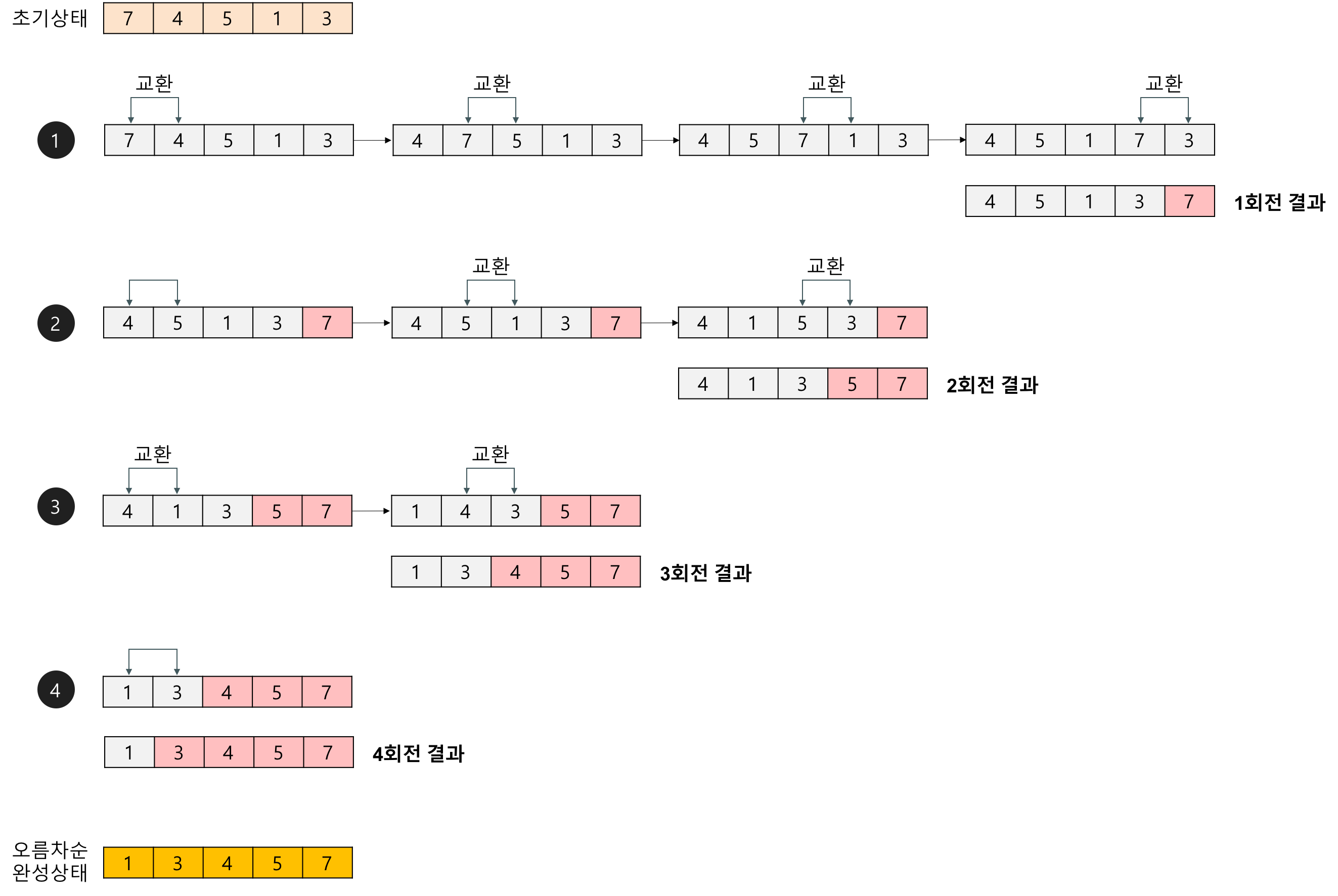 이 알고리즘은 배열을 순회하면서 인접한 두 원소의 크기를 비교하여 필요에 따라 교환한다.