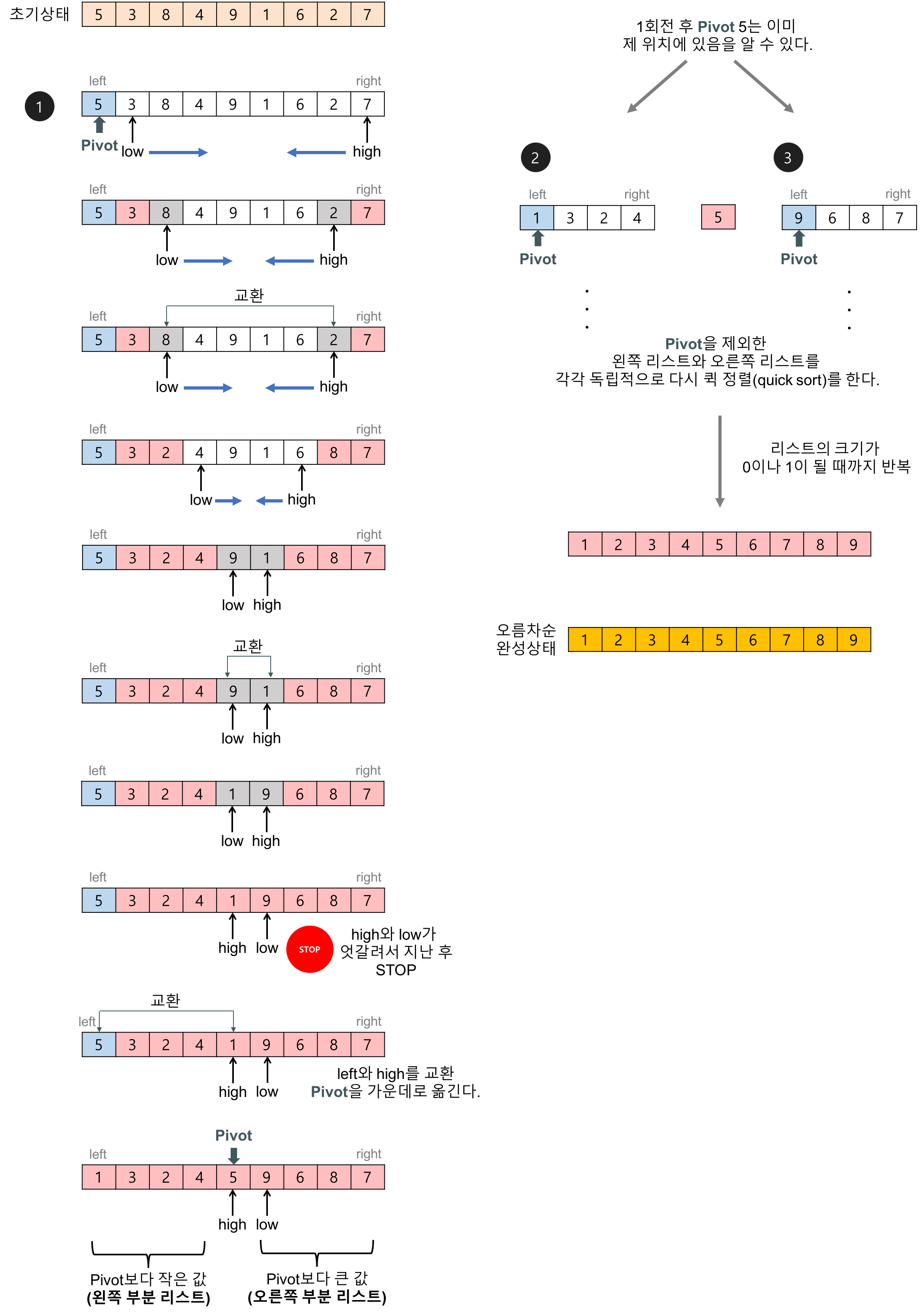 추가적으로 퀵 정렬은 동일한 키 값을 가진 원소들의 상대적인 위치가 변할 수 있는 안정적이지 않은 정렬 알고리즘이다.