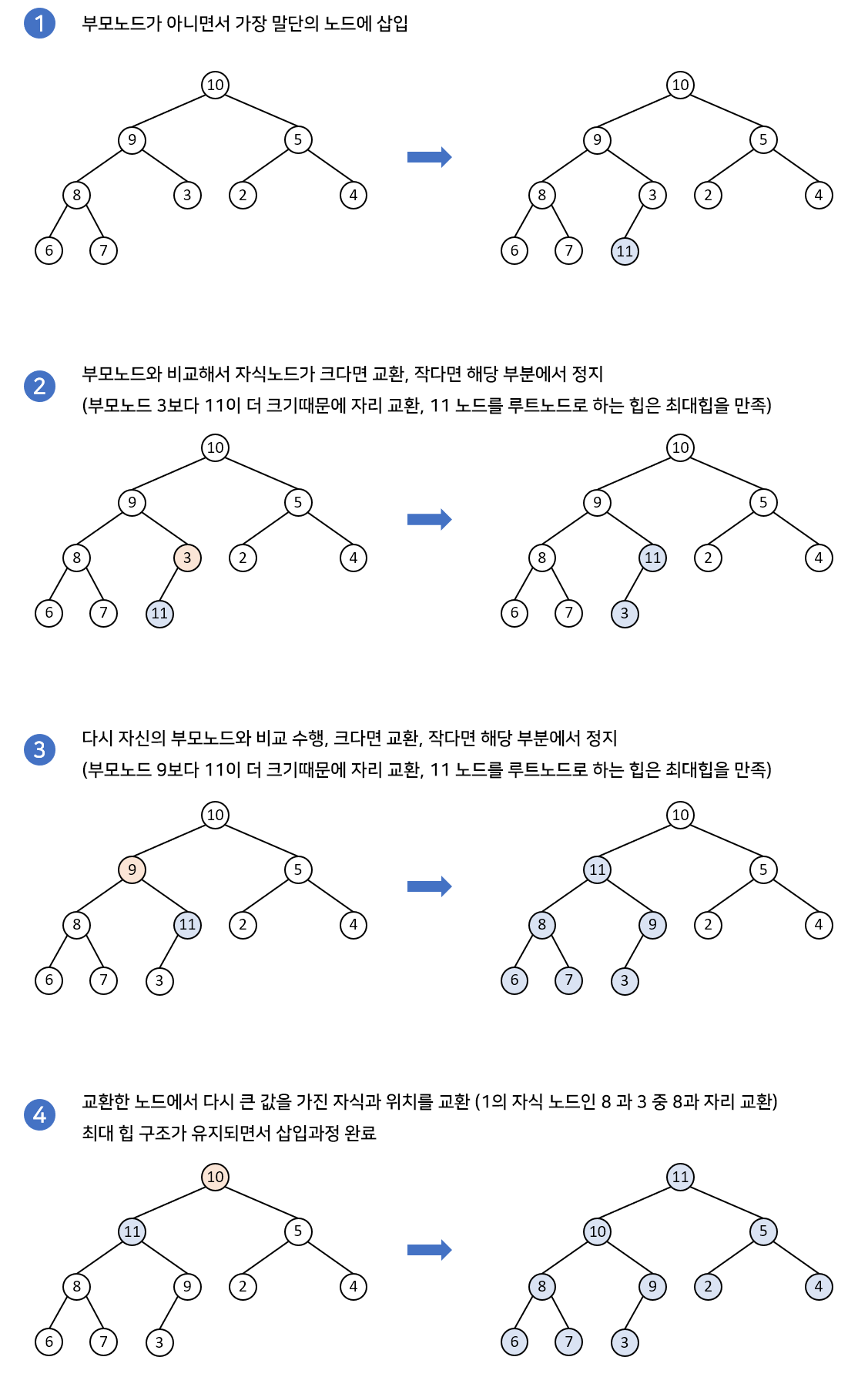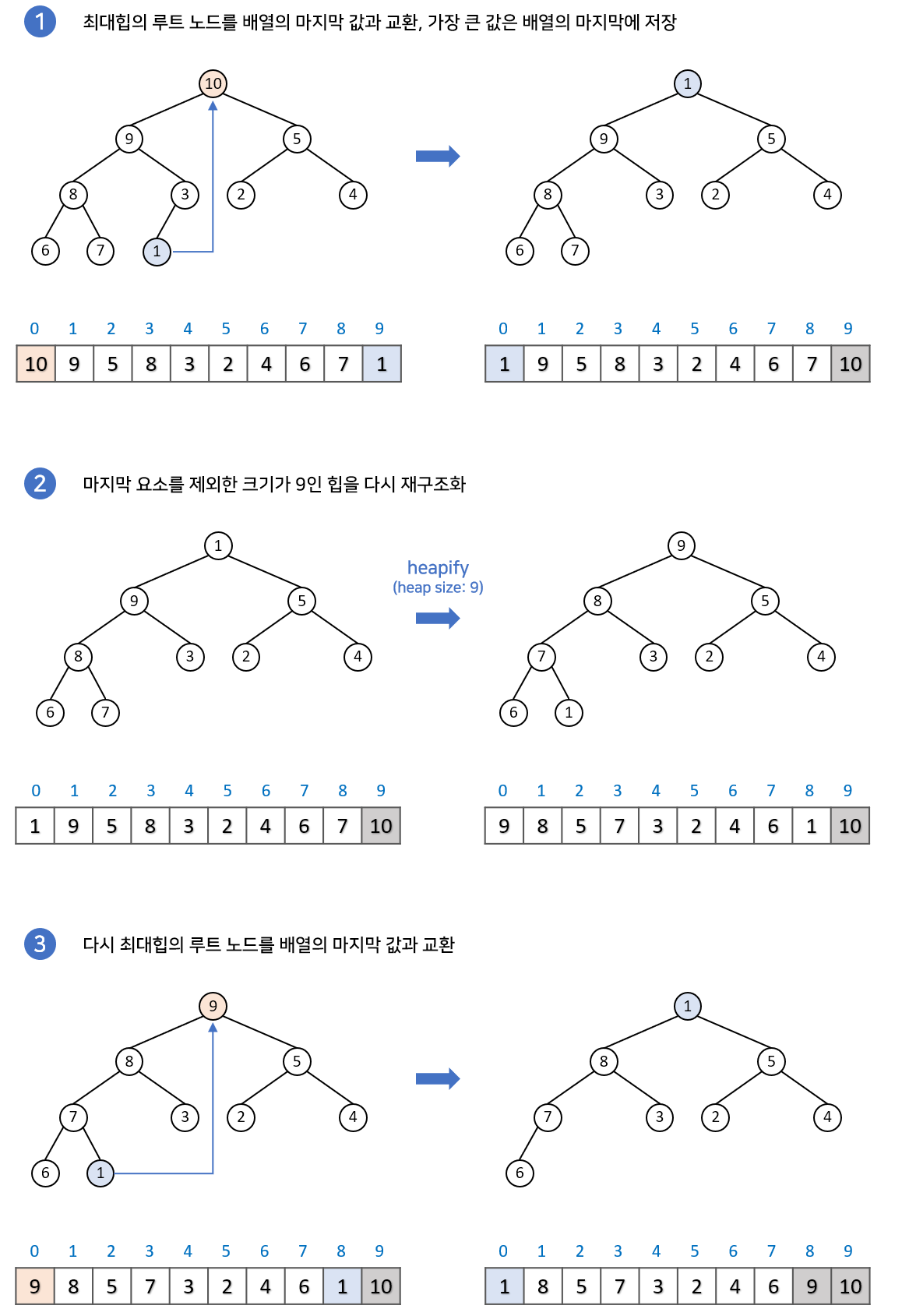 // largest가 현재 노드와 다르다면 교환하고 재귀적으로 힙 조정