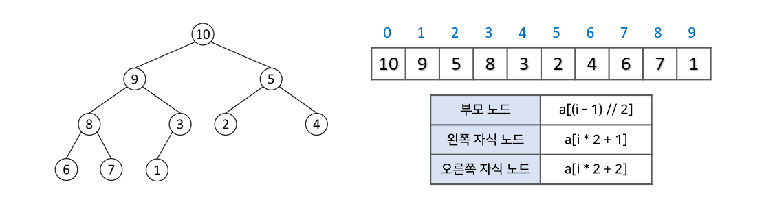 힙은 대체적으로 배열로 구현된다. 완전 이진 트리를 기본으로 하기 때문에 비어 있는 공간이 없어 배열로 구현하기에 용이하다.
