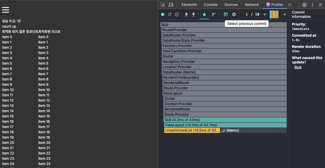 최적화된 컴포넌트와 되지 않은 컴포넌트를 비교해 보도록 하겠다.