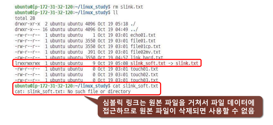 심볼릭 링크는 새로운 inode를 생성해 원본 파일을 가리키게ㅔ 되므로 원본 파일인 slink.txt 파일을 삭제하게 되면 심볼릭 링크는 사용할 수 없다.