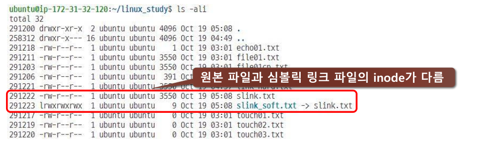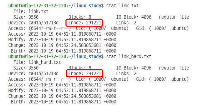 드 링크한 파일의 Inode 값이 같을 것을 확인할 수 있다.