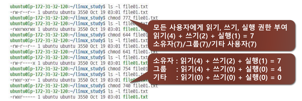 퍼미션을 부여하거나 변경하는 며령은 chmod(change mode)이며 권한을 적용할 때 8진수 (absolute mode)를 사용하는 방법과 기호(bymboilc mode)를 사용하는 방법이 있다. 우리는 8진수를 사용하는 방법에 대해 알아 볼 것이다. 퍼미션은 "소유자/그룹/기타사용자"에 대해서 읽기(4),쓰기(2),실행(1) 권한을 조합해 숫자로 지정하는데 이 때 8진수 (2진수 3자리)를 사용해 권한을 부여하며 아무 권한도 주지 않으려면 해당 사용자 자리에 0를 지정하면 된다.