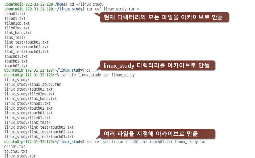 파일 아카이빈(Archiving)은 백업 등의 목적으로 여러 디렉터리난 파일 들을 하나로 묶는 것을 의미하는데 , 이렇게 묶은 아카이브 파일을 추가로 압축(Compress)을 통해서 파일의 용량을 줄여서 관리하는 경우가 대두부분이다.