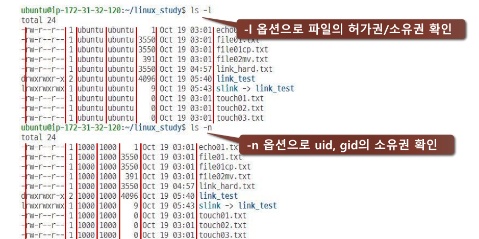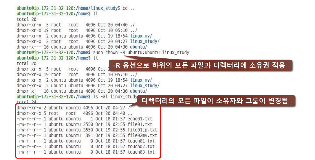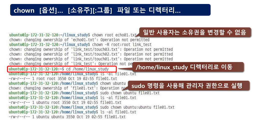 파일 또는 디렉터리의 소유자를 변경할때는 chown(change owner) 명령을 사용하며 소유권(Owner shop) 벼경 명령은 오직 루트 계정만 사용할 수 있는 명령이다.