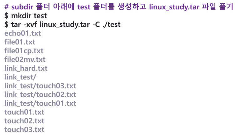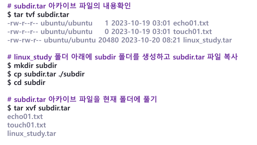 여러개의 파일을 하나의 파일로 묶거나 풀때 tar(Tape archives) 명령어를 사용한다.