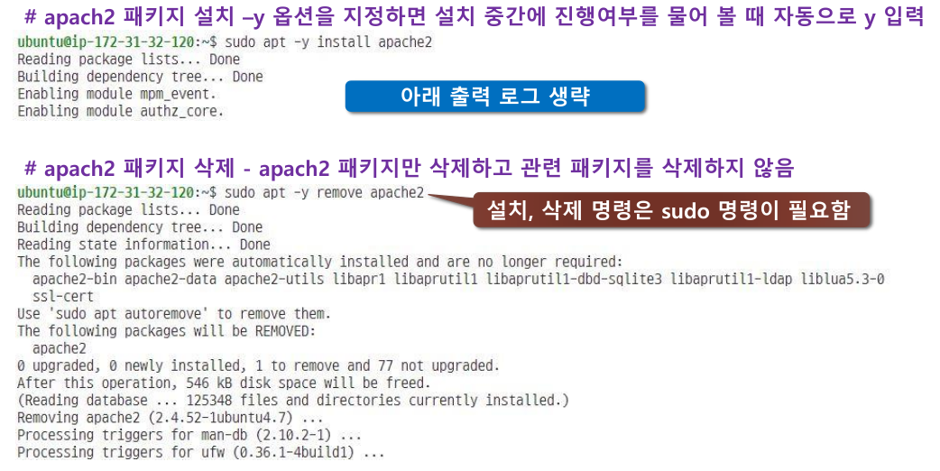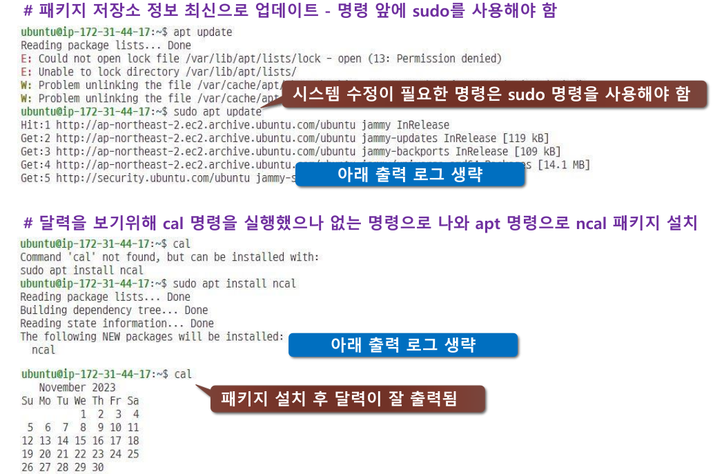 apt 명령은 시스템의 핵심을 다루는 명령의므로 관리자 권한이 필요하기 때문에 sudo 명령과 같이 사용해야 한다.