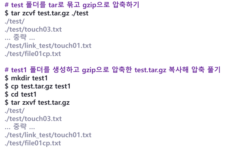 일반적으로 tar를 통해 하나로 합쳐진 아카이브 파일을 gzip 또는 bzip2 방식을 사용해 압축하는데 gzip 또는 bzip2 명령을 따로 수행하지 않고 파일을 하나로 묶으면서 tar 명령의 옵션만으로 압축을 할 수 있기 때문에 아카이브와 압축을 한 번에 진행하는 방식이 많이 사용된다.