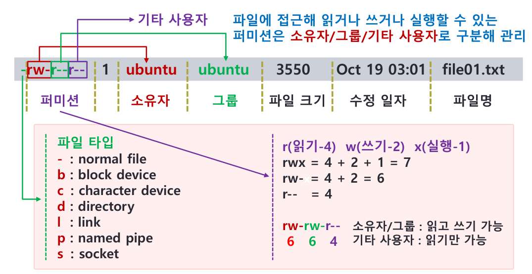퍼미션은 "소유자/그룹/기타 사용자"로 구분해 관리하며 각각의 파일이나 디렉터리는 소유할 사용자와 그 사용자가 속한 그룹을 지정해 관리한다. 그러므로 사용자는 자신에게 읽기 권한이 부여된 파일만 읽을 수 있고 쓰기 권한이 부여된 파일만 쓰기와 수정이 가능하며 실행 권한이 부여된 파일만 실행할 수이 다. 또한 디렉터리는 실행 권한이 부여된 사용자만 그 디렉터리 안으로 들어갈 수있다.