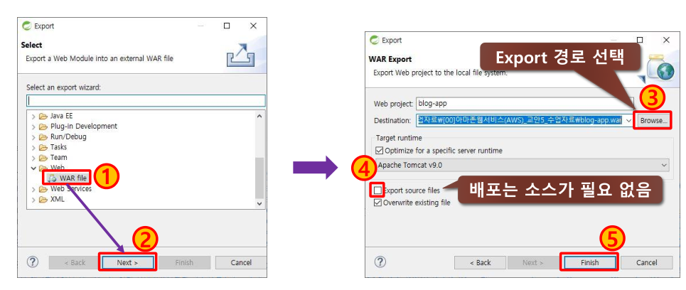 SpringSTS에서 스프링프로젝트를 Export 할 때 아래 그림과 같이 WAR file 메뉴를 이용해 Export 하고 앞의 자바 웹 앱 배포하기를 찾고해 EC2서버에 설치된 톰캣 서버에 배포하면 된다. 수업 시간에 제공하는 blog-app은 스프링프레임워크로 작성된 프로젝트로 MySQL DB와 연동하는 앱으므로 이 교안 바로 뒤에 나오는 RDS에 DB를 만들고 테이블을 생성한 후에 스프링 앱을 배포한다.