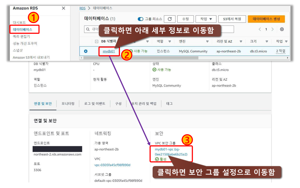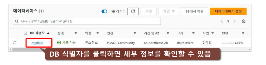 데이터베이스 생성이 완료 되었으면 새롭게 생성한 MySQL 데이터베이스에 접속하기 위해서 아래 그림과 같이 "DB 식별자" 의 링크를 클릭해 세부정보를 확인할 수 있는 화면으로 이동한다.