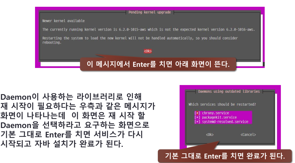자바가 설치되고 자동으로 잡바 설정 update-alternatives 명령이 적용된 후 다음과 같은 당황스런 메세지가 화면에 출력된ㄴ다. 신규로 설치한 최신 Kernel을 사용하기 위해서 재부팅이 필요하다는 Kernel Hint가 발생한다.