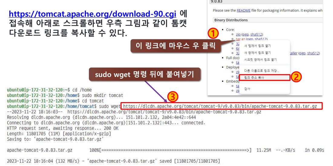 먼저 톰캣 다운로드 페이지에 접속해 다운로드 받을 주소를 복사하고 터미널을 이용해 EC2 서버의 home 디렉터리 하위에 톱캣을 설치할 디렉터리를 만들고 톰캣을 다운로드 받자