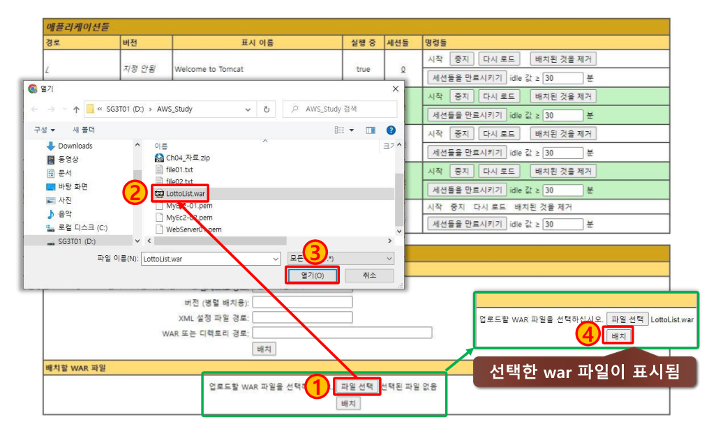 배포할 LottoList.war 파일을 선택하고 “배치” 버튼을 클릭해 앱을 배포한다.