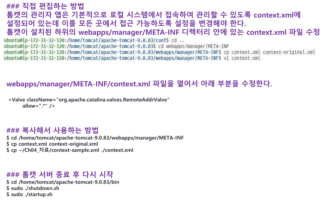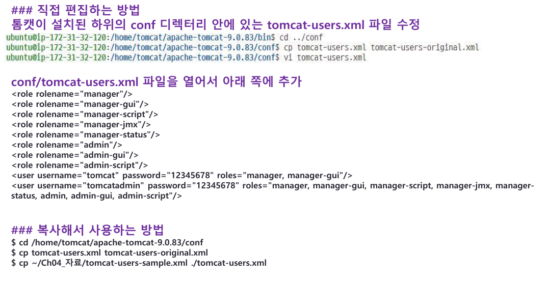일을 수정해야 한다는 내용과 conf/tomcat-users.xml 파일에 웹앱을 사용할 수 있는