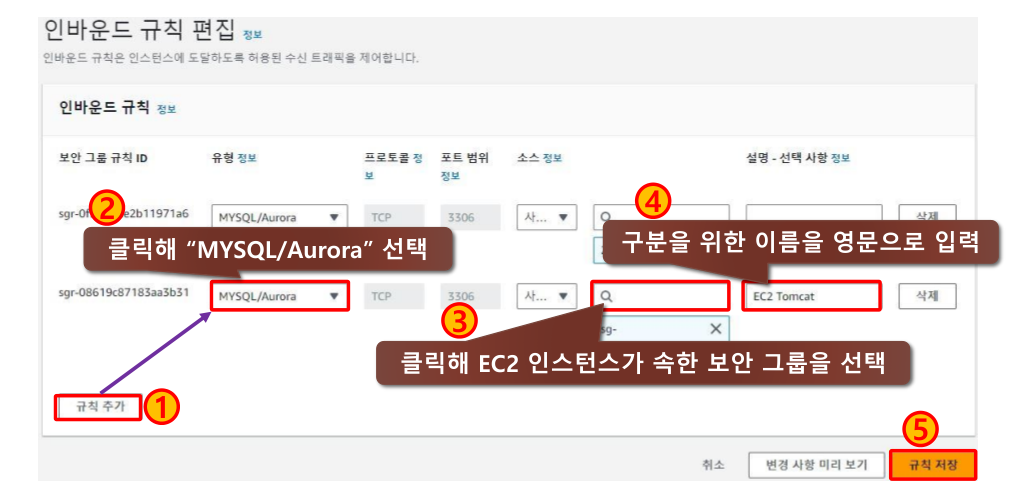 인바운드 규칙 편집 화면에서 다음 그림을 참고해 EC2인스턴스가 속해 있는 보안 그룹을 인바운드 규칙에 추가한다.