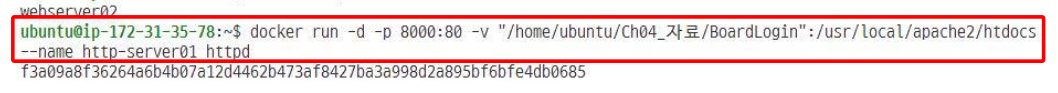 우리가 작성한 html 문서를 실행해 보자. 다음과 같이 -v 옵션을 지정해 컨테이너를 실행하면 호스트 컴퓨터의 특정 디렉터리와 컨테이너의 특정 디렉터리를 연결하면 호스트 컴퓨터의 특정 디렉터