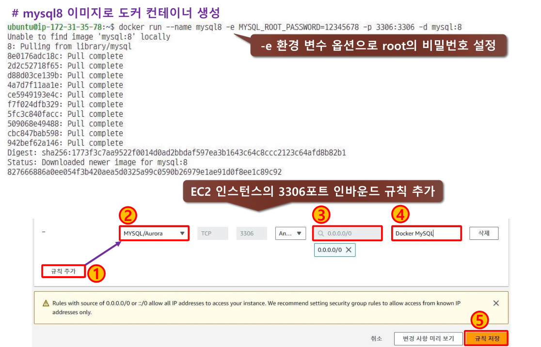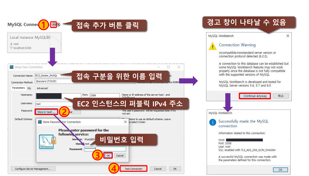 릭해 도커 컨테이너로 생성한 MySQL에 접속해서 데이터베이스를 생성한다
