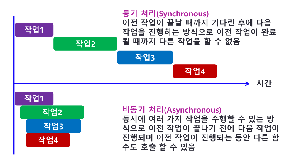 자바스크립트에서는 여러 함수를 작성하여 실행하게 되는데 실행 시간이 다른 함수를 원하는 처리 순서에 따라서 실행되도록 프로그래밍 하는 것을 비동기 처리라고 한다.