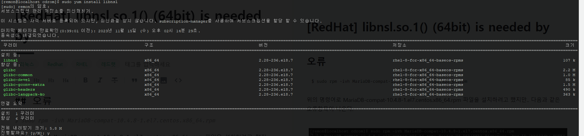 libnsl.so.1() (64bit) is needed by MariaDB-compat-10.4.8-1.el7.centos.x86_64 라는 오류가 발생한다