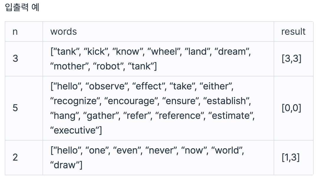 ∙ 만약 주어진 단어들로 탈락자가 생기지 않는다면, [0, 0]을 return 해주세요.