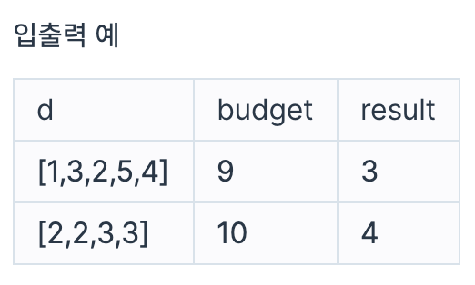 부서별로 신청한 금액이 들어있는 배열 d와 예산 budget이 매개변수로 주어질 때, 최대 몇 개의 부서에 물품을 지원할 수 있는지 return 하도록 solution 함수를 완성해주세요.