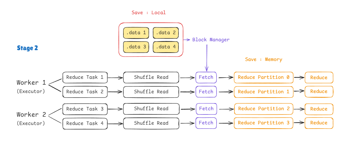 이때, 별도의 전송 Task를 만들지 않아도 Block Manager를 통해서 각 Worker에 존재하는 Partition 별 데이터를 요청할 수 있습니다.