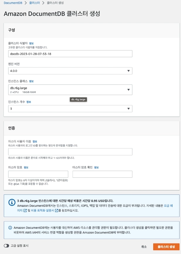 ( AWS 웹 페이지에서 DocumentDB를 검색 -> 클러스터 -> 클러스터 생성 )