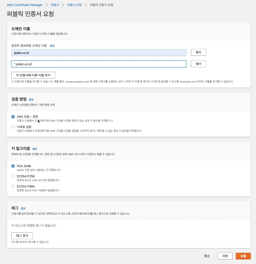 ( AWS 웹 페이지에서 Certification Manager를 검색 -> 인증서 -> 인증서 요청 )