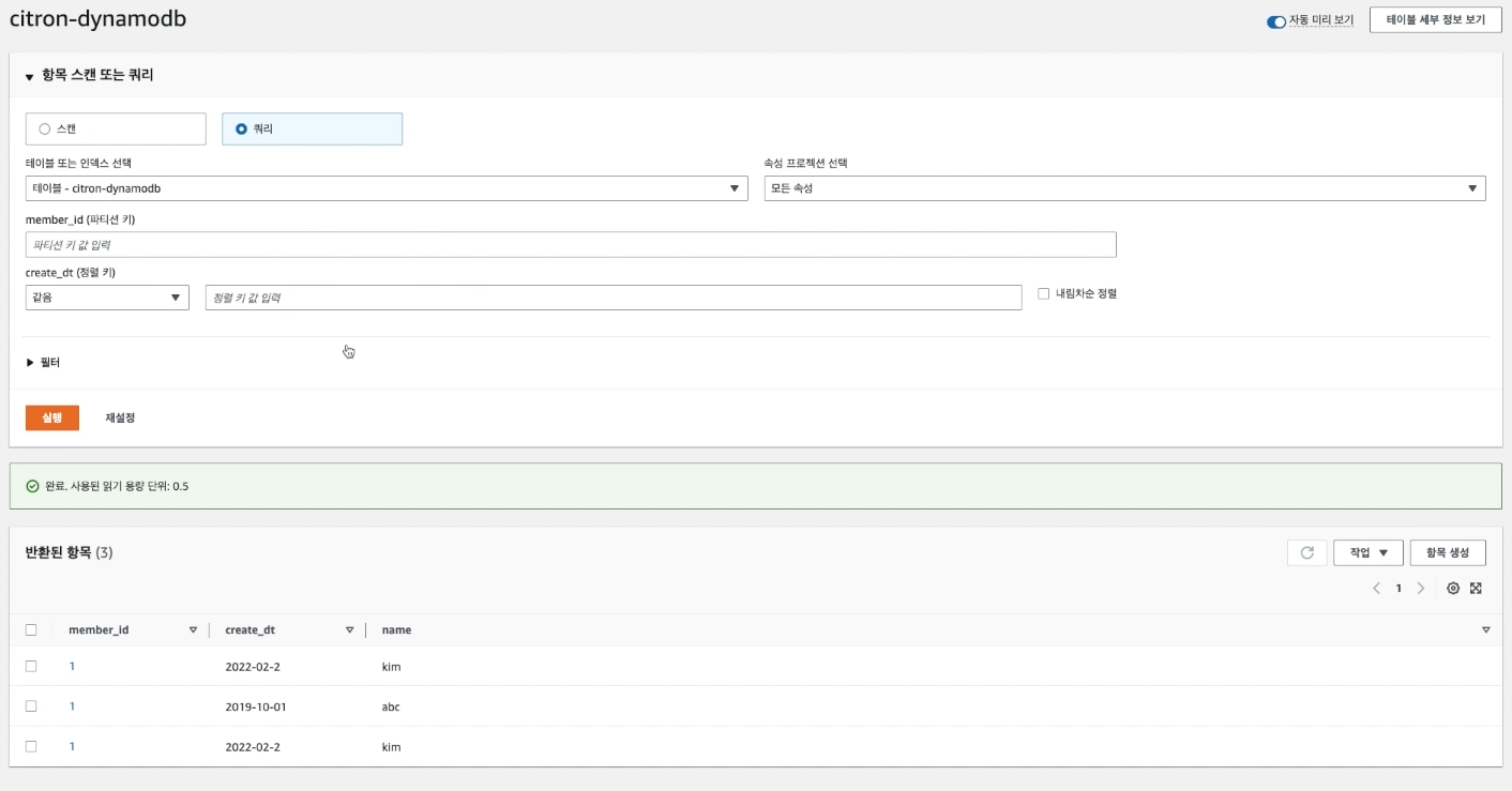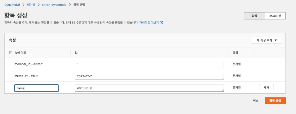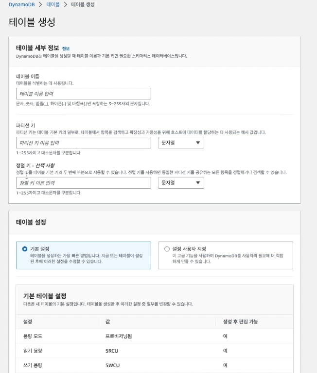 ( AWS 웹 페이지에서 DynamoDB를 검색 -> 테이블 -> 테이블 생성 )
