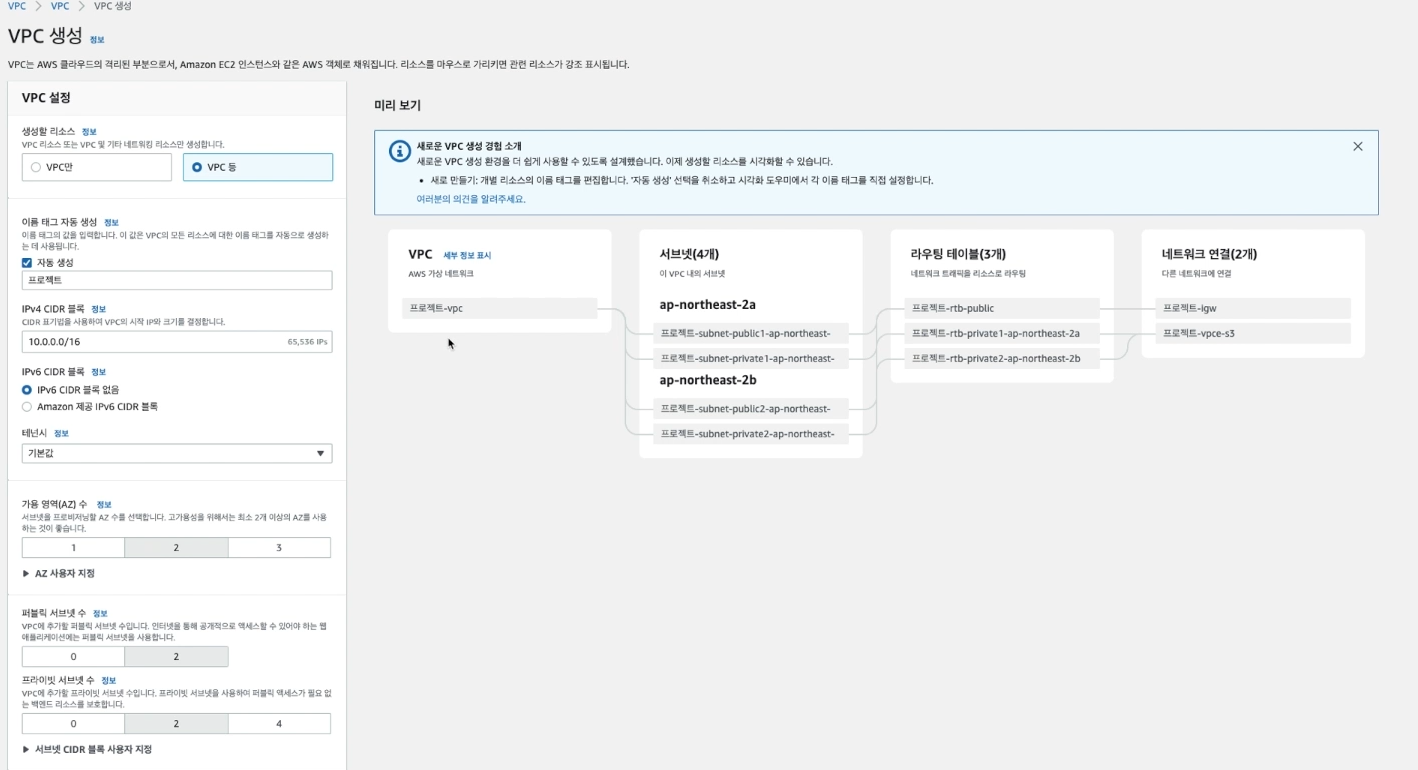 VPC 등을 선택할 경우, 편리하게 한번에 생성 가능