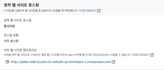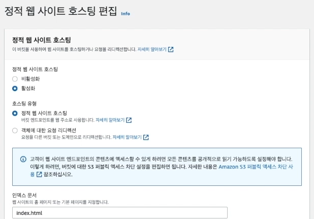 ( 버킷 -> 만든 버킷 선택 -> 속성 -> 정적 웹 사이트 호스팅)