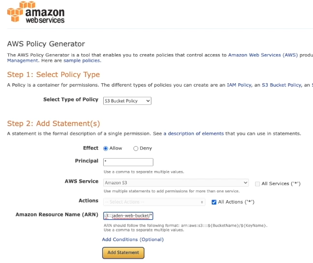 ( 버킷 정책 편집 -> 정책 생성기 )