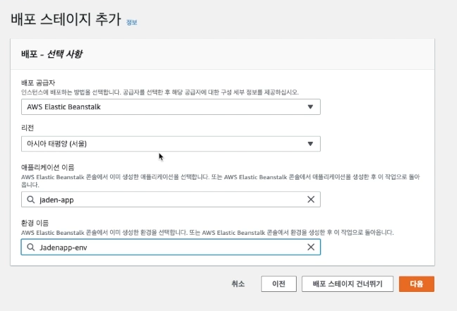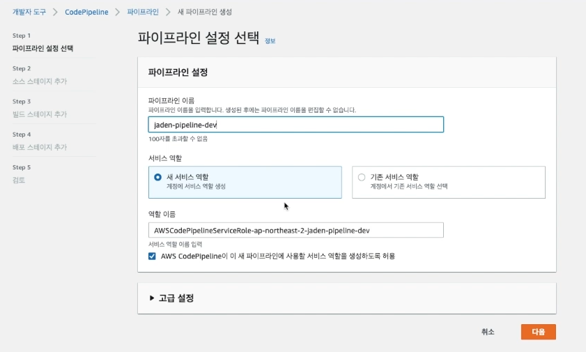 소스 공급자(CodeCommit), 빌드 스테이지(CodeBuild), 배포 스테이지(CodeDeploy)를 등록