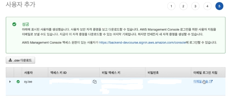 사용자 추가 완료 후 액세스 키를 안전한 곳에 보관할 것