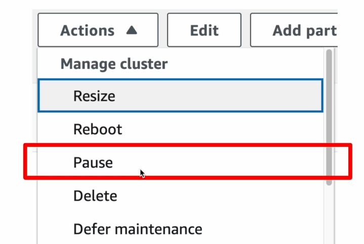 중지는 Redshift가 고정 비용 옵션인 경우에만 해당되는 옵션입니다. 가변 비용 옵션(Severless)인 경우에는 중지 기능이 없습니다.