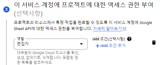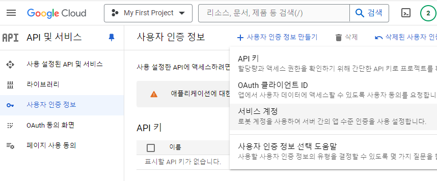 ( API 및 서비스 -> 사용자 인증 정보 -> 서비스 계정 )