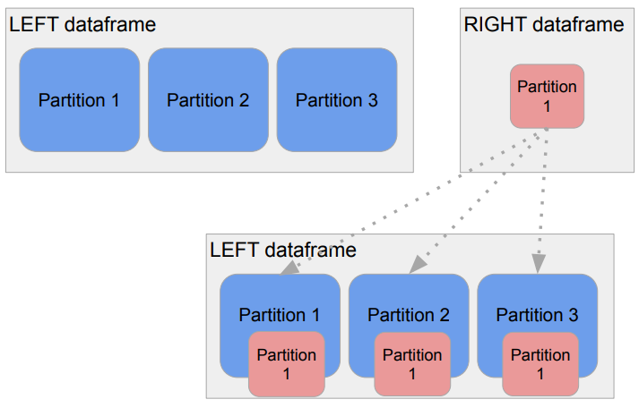 작은 데이터프레임 전체를 다른 데이터프레임이 있는 파티션들로 뿌리는 것