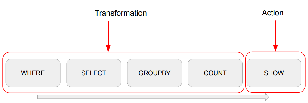 Spark는 WHERE, SELECT, ... 등의 작업을 지정한다고 해서 바로 실행하는 것이 아니고 Action이라고 부르는 특정 작업이 수행이 될 때 그 때서야 연산이 수행이 됩니다.