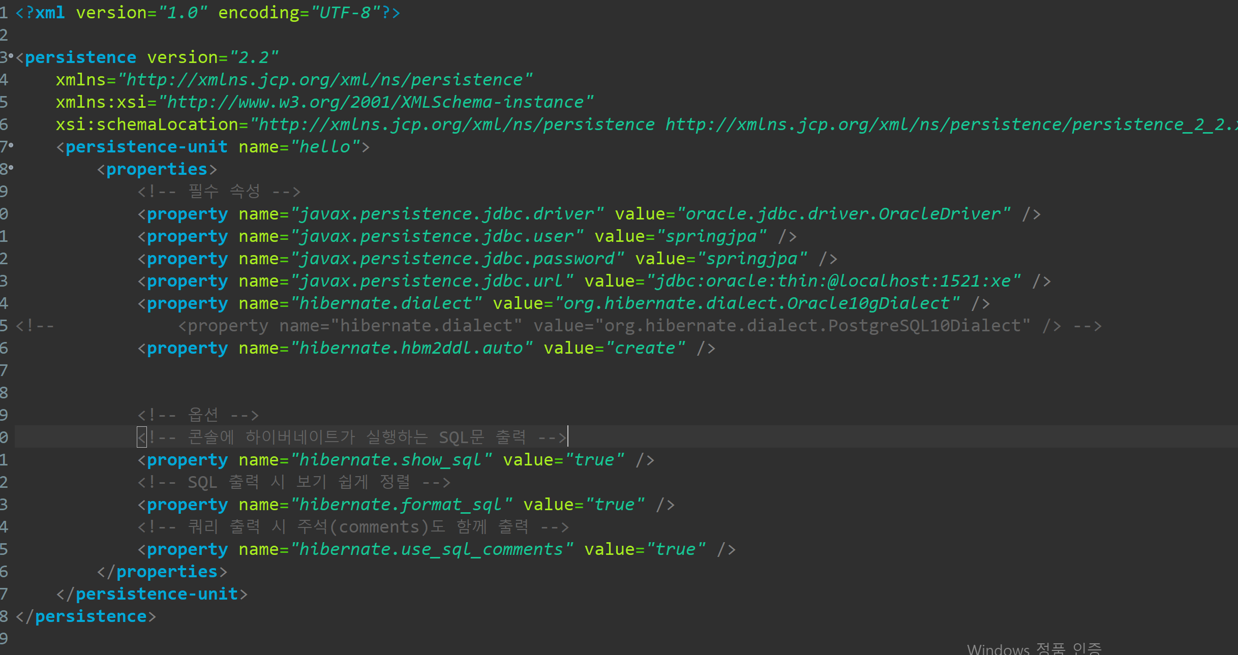 persistence.xml은 < persistence >로 시작하며 xmlns에 네임 스페이스, version에 사용할 JPA버전을 지정한다.