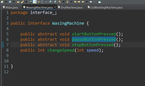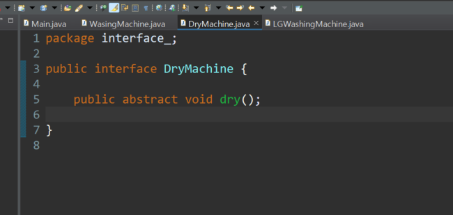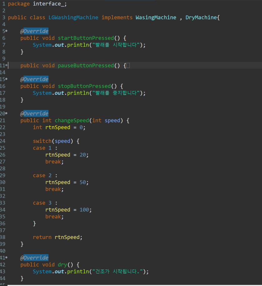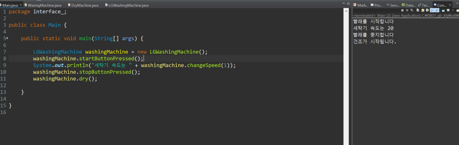 μλ‘μ΄ ν΄λμ€μ implementsλ‘ μΈν°νμ΄μ€λ₯Ό μμνκ³ wahsinMachine κ³Ό dryMachineμ μμλ°μμ¨λ€. κ·Έλ¦¬κ³ λ©μλμ μΆλ ₯ν κ°μ λ£μ΄μ€λ€.