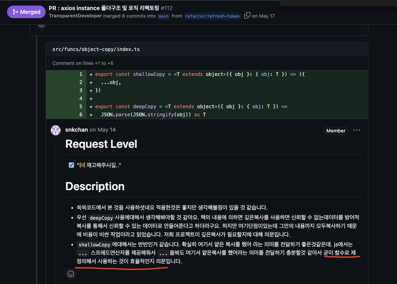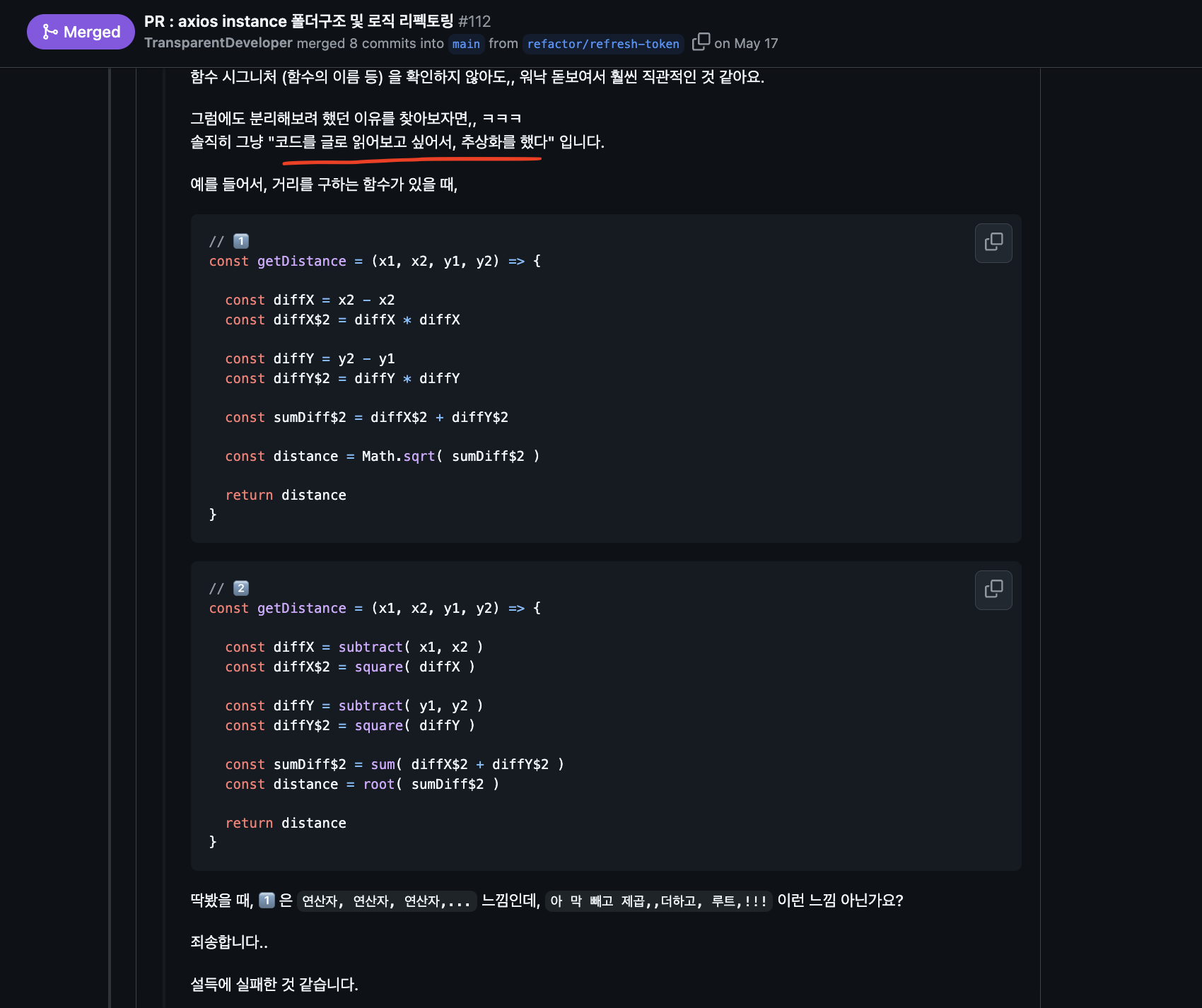 는 고작 한 줄의 코드 분리한 건데 굳이 따로 선언할 필요가 있는지에 대한 댓글이 있었다.![]()