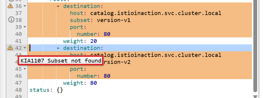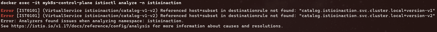 출력은 부분집합을 찾지 못했음을 보여준다. 오류 메시지 외에 istio 오류 코드 IST0101 도 제공
